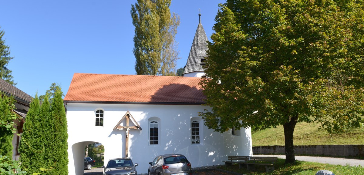 Es handelt sich um einen Rechteckbau mit 3/8 Chor unter einem gemeinsamen Satteldach. Im Westen ist ein Rundbogendurchgang durch den bis 1953 die Straße führte. Der Turm im Norden weist ein achteckiges Obergeschoß mit 4 Rundbogenschallöffnungen auf. Gekrönt wird er von einem Spitzhelm. Der Betraum mit Flachdecke über Hohlkehle, eingezogener Chorbogen, der Chor stark erhöht mit Gewölbe.