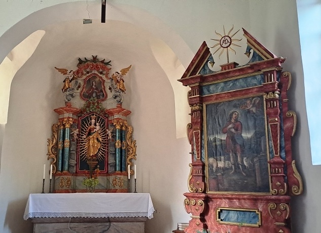 Aufbau mit zwei Säulen Rocaille- und Volutendekor um 1770. Figur Maria mit Kind von Erasmus Kern um 1630. Oberbild hl Wendelin Ende 18. Jhdt. Am Gebälk Engel, Ende 18. Jhdt., Standkreuz Ende 19.Jhdt