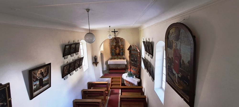Die Nordwand weist ein, die Südwand zwei Flachbogenfenster auf. Im Westen eine Empore mit Aufgang. Die Sakristei ist im Turmgeschoß eingebaut und weist ein Kreuzgratgeölbe auf.