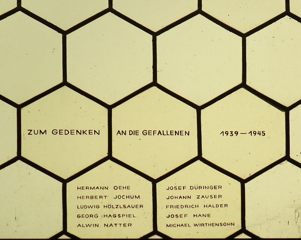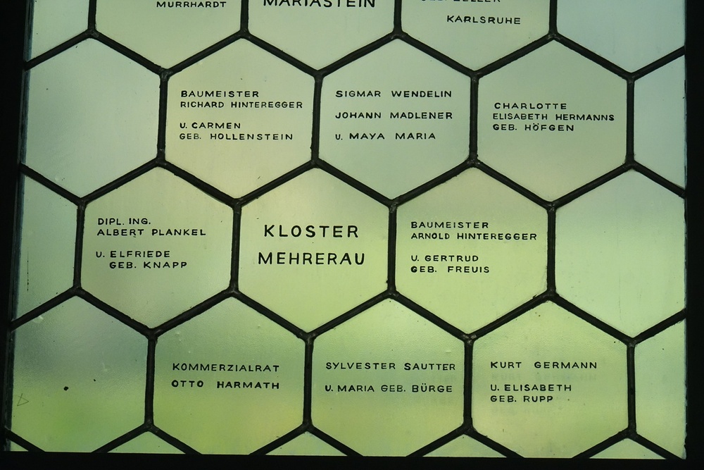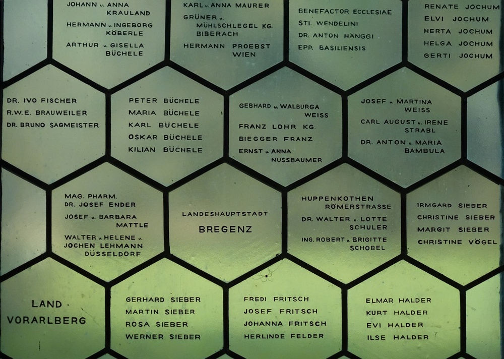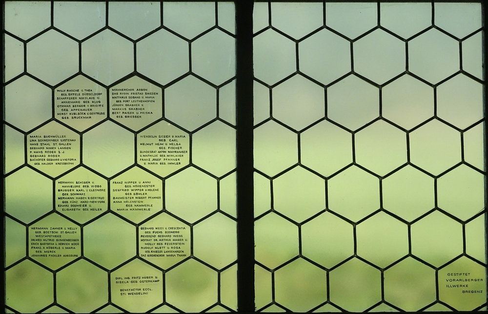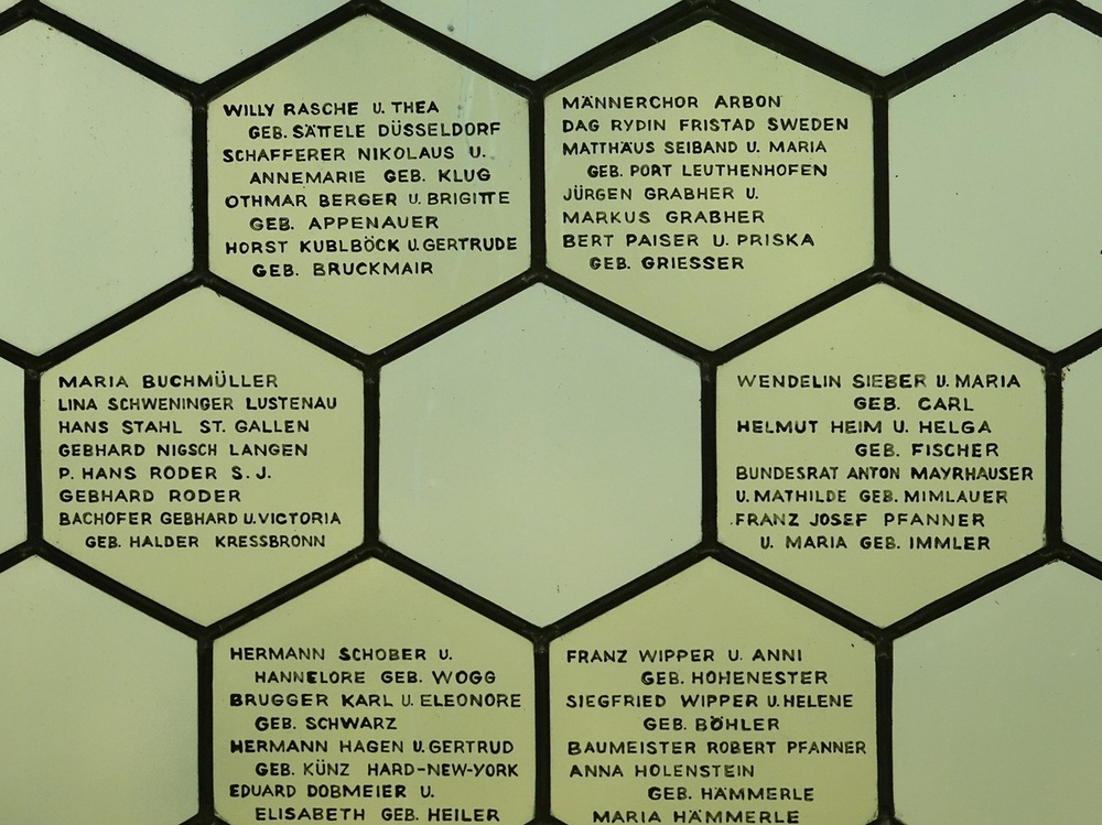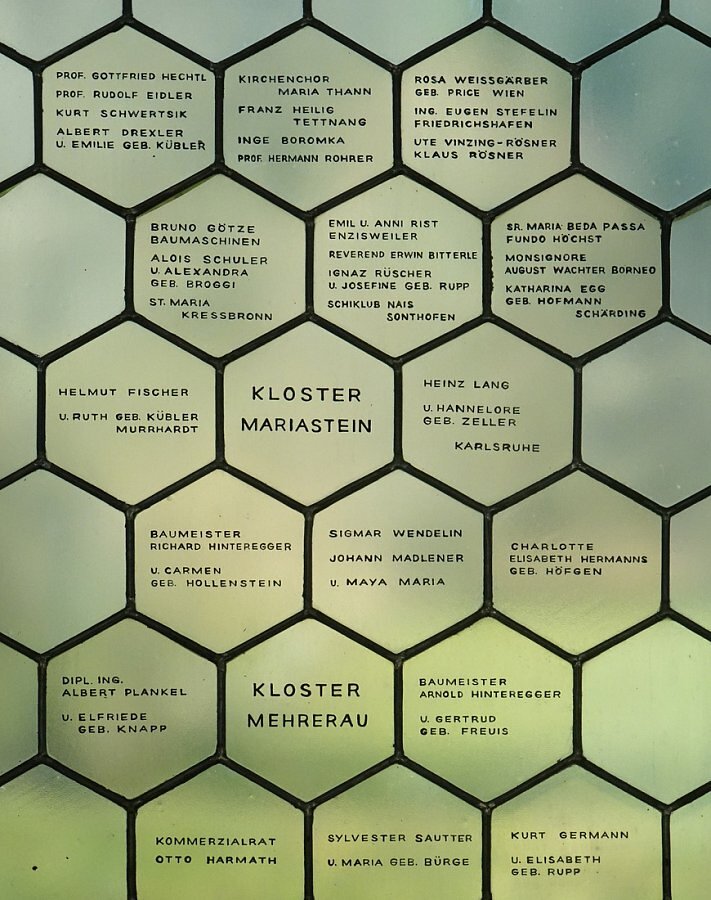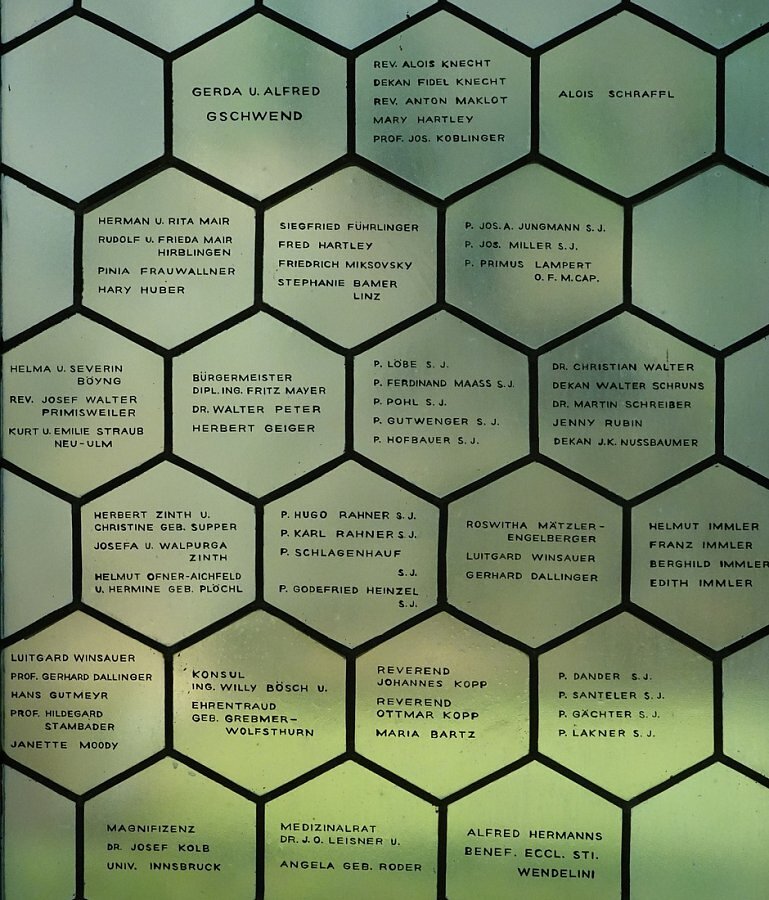 Klarglasfenster mit äußerst zahlreichen Stifternamen. Hier stellen die Fenster den bemerkenswerten Sonderfall dar, dass weder dekorative noch