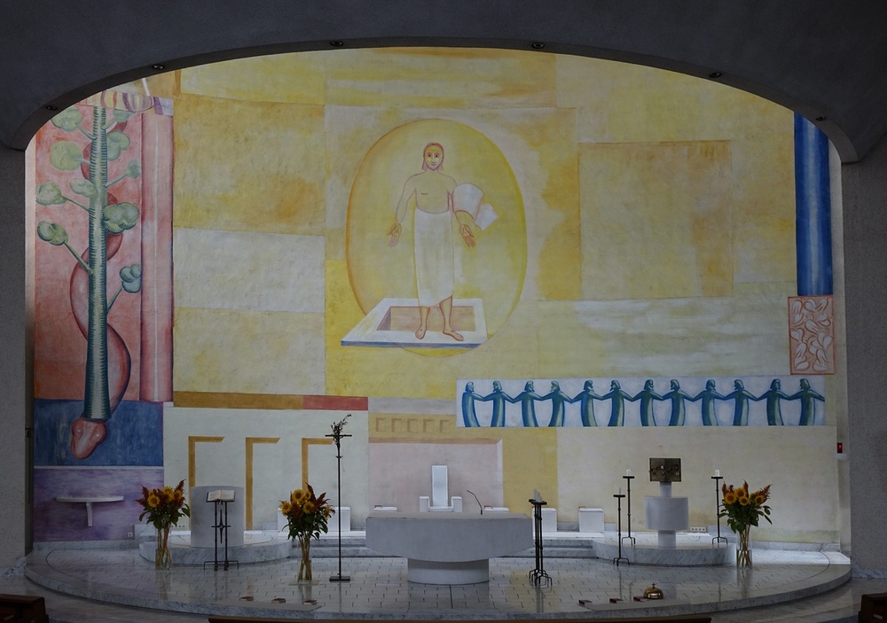 Dornbirn-Schoren, Bruder Klaus, Altarwand, Fresko, 1987, Maler Hubert Schmalix