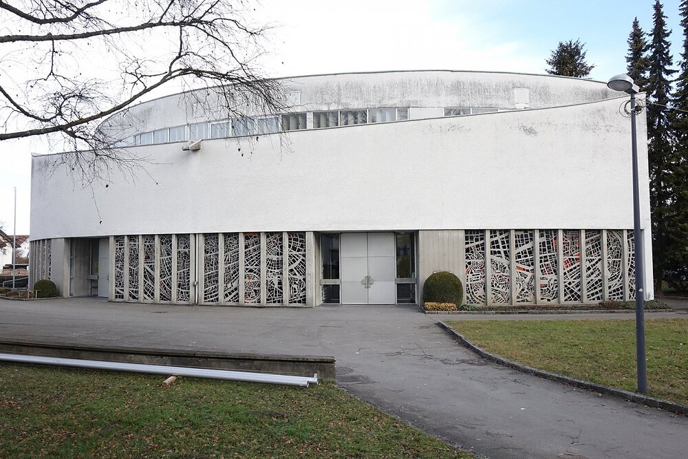 1962 / 63 Neubau von Architekt Herbert Kotz, Zentralbau auf elliptischem Grundriss mit hohen Fensterwänden, angebaute Taufkapelle und freistehender Turm.