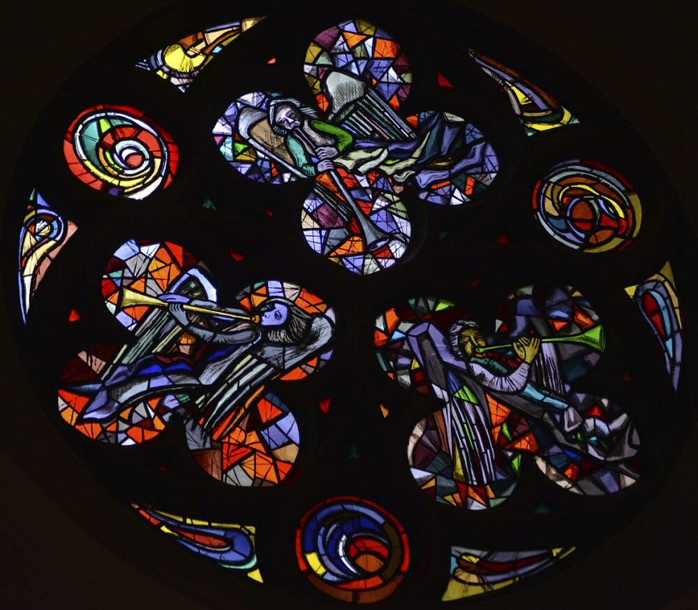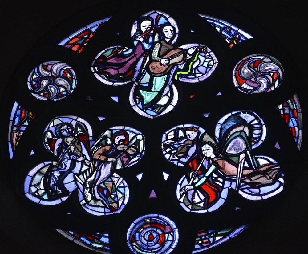Feldkirch, Dompfarrkirche hl. Nikolaus, Rosette Musizierende Engel, Martin Häusle 1960