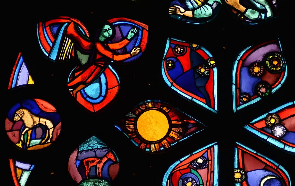 Feldkirch, Dompfarrkirche hl. Nikolaus, Detail, Rosette Schöpfung, Martin Häusle 1960
