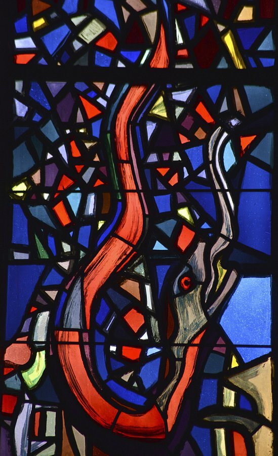 Feldkirch Dompfarrkirche hl. Nikolaus, Detail Schlange, Vertreibung aus dem Paradies, Martin Häusle 1960