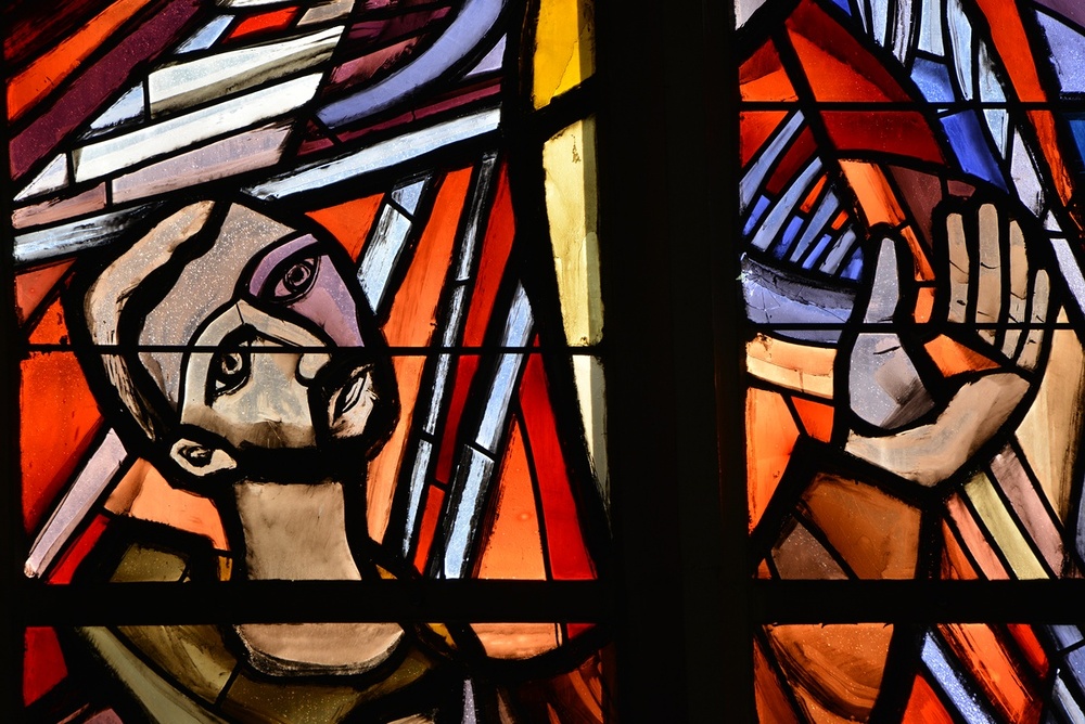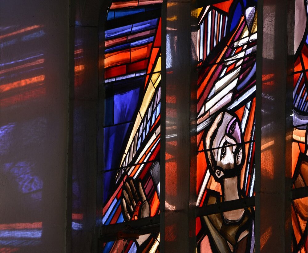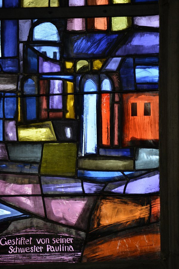 Langhausfenster von Martin Häusle 1965, Engel mit hl. Franziskus, hl. Albertus Magnus