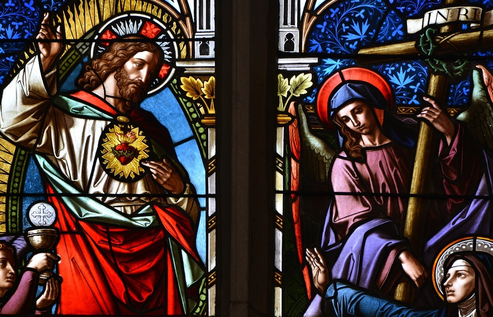Glasgemälde im Chor; links Vermählung Mariä, rechts Christi Offenbarung an hl. Margaretha Alacoque, um 1890 Tiroler Glasmalereianstalt, Innsbruck