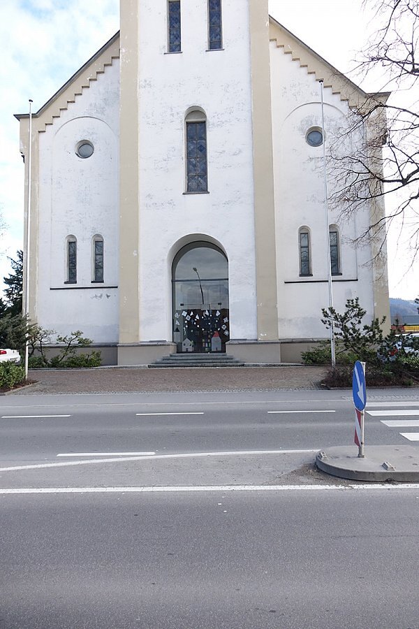 Langhaus li. Kreuz, Kelch, Öllampe und Fegefeuer, hl. Cäcilia, Christus mit Jüngern, Hochzeit zu Kana, Kommunion, Schutzmantelmadonna (li. Kapelle), Verkündigung Mariens; re. Christus und Kinder, Christus heilt Kranke, bez.."Entwurf Gottlieb Schuler, Ausführung Tiroler Glasmalereianstalt, Innsbruck", Christus und Petrus, König David, Sanduhr und Totenkopf, an der Fassade in Kreisfenstern li. Krone und Lilie, re. Waage
