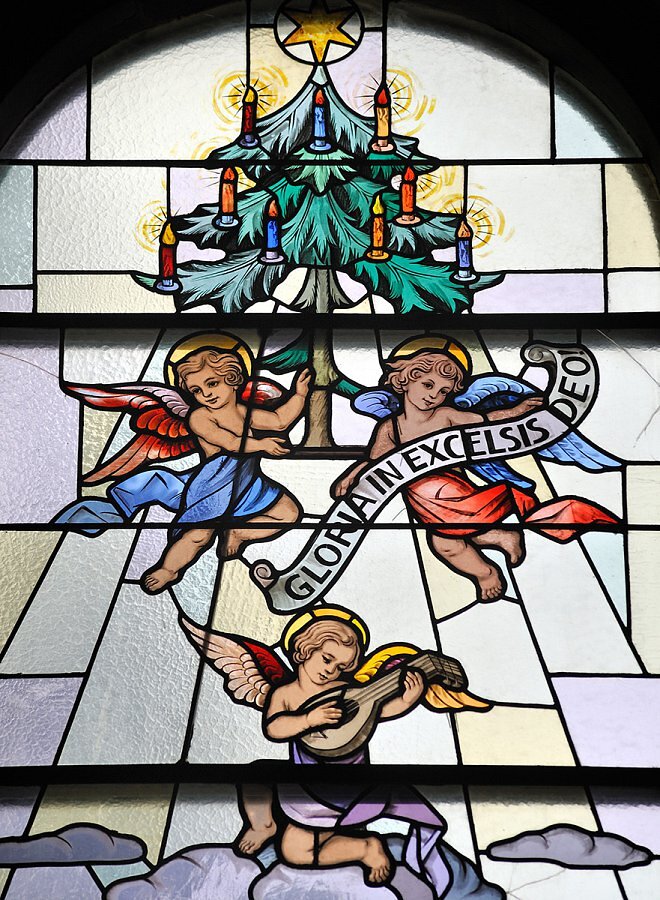 Chor li. Anbetung der Könige, in kleinen Fenstern li. Ähre und Weintraube, re. Monstranz und Kelch
