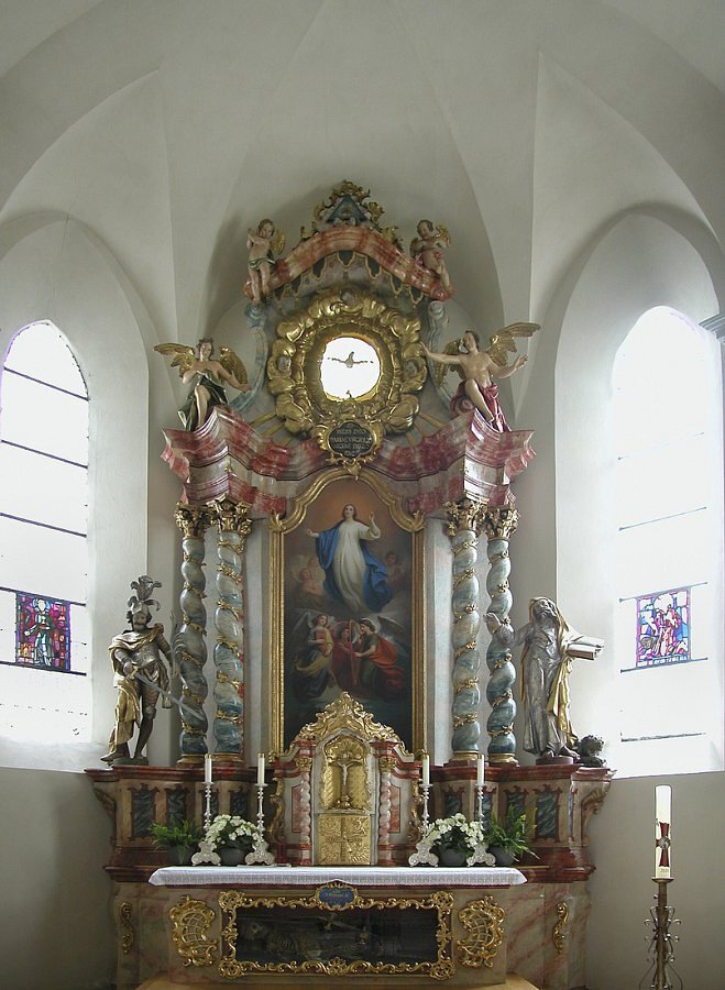 links hl. Meinrad, rechts hl. Gerold von Andreas Amann, 1954, rechts hl. Ulrich, bez. "Fred Hochschwarzer 1978".