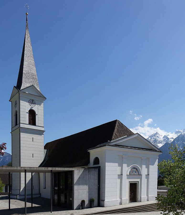 881 kam die Pfarrkirche an das Domkapitel Chur. Barocker Bau mit gotischem Chor, 1826-27 Verlängerung, klassizistische Fassade und Turm.