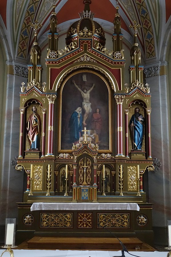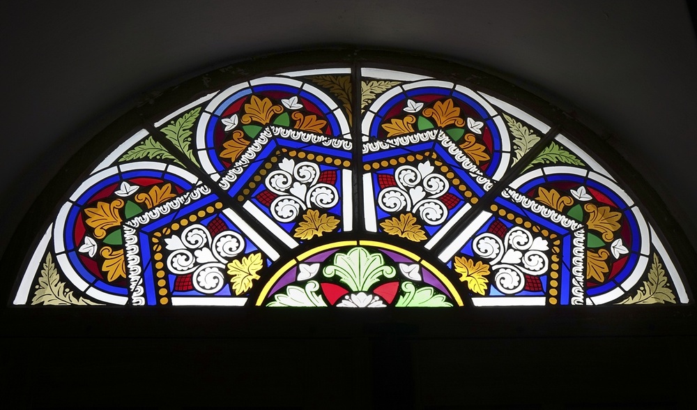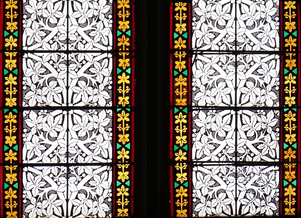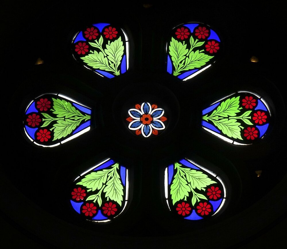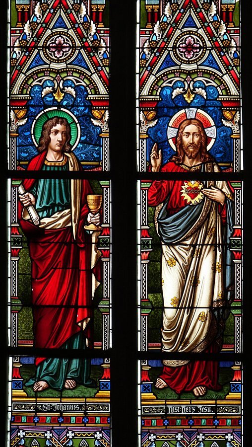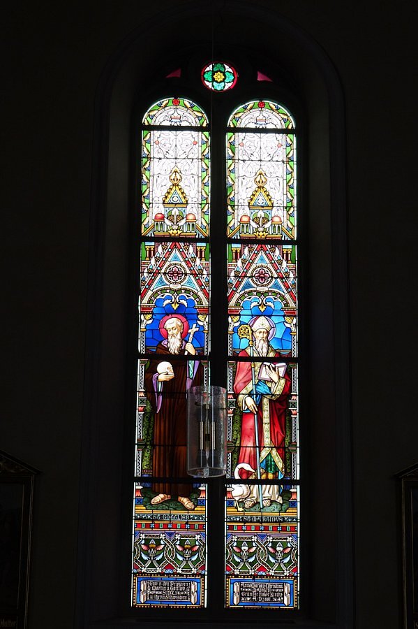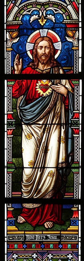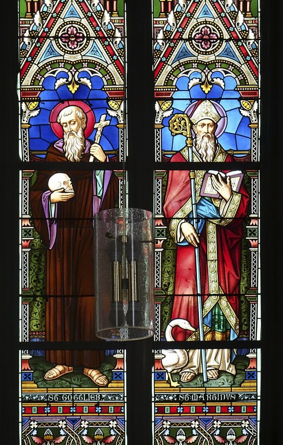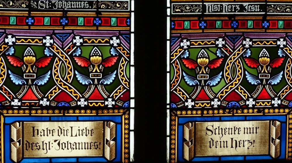 Glasfenster, bez. 1877: hl. Johannes, Herz Jesu, hl. Gottlieb, hl. Martin