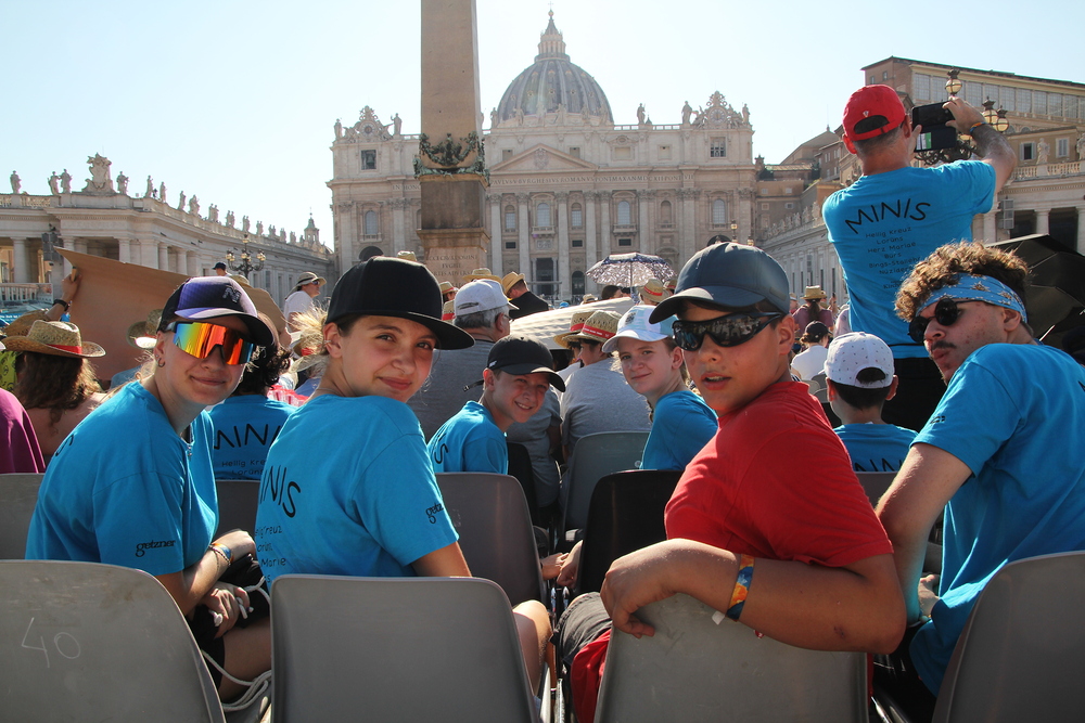 Zwei Busse starteten am Sonntag mit den Minis und ihren Begleitpersonen in Richtung Süden. Dort erwartet sie nicht nur eine buchstäblich heiße Woche mit über 34 Grad, sondern vor allem viele Erlebnisse. Höhepunkt war die Begegnung mit Papst Franziskus am Dienstag, der seinen Urlaub für die Ministranten unterbrach, um den Kontakt mit den Jugendlichen aus Europa zu suchen. „Ich bin das erste Mal in Rom. Mir gefällt es hier sehr gut, vor allem die vielen Kleinigkeiten, die man entdecken kann. Und es war schon sehr cool, den Papst mal in echt zu sehen“, beschreibt Leonardo Reichert, 20, aus Ludesch seine ersten Eindrücke. Der zwölfjährige Elias Schmid aus Lochau ist ebenfalls das erste Mal in Rom: „Ich bin schon seit 5 oder 6 Jahren Ministrant und ich finde es sehr toll, dass es die Möglichkeit gibt, gemeinsam nach Rom zu fahren. Ich freue mich auch schon sehr auf das Kolosseum und den Strandausflug mit allen österreichischen Minis.“