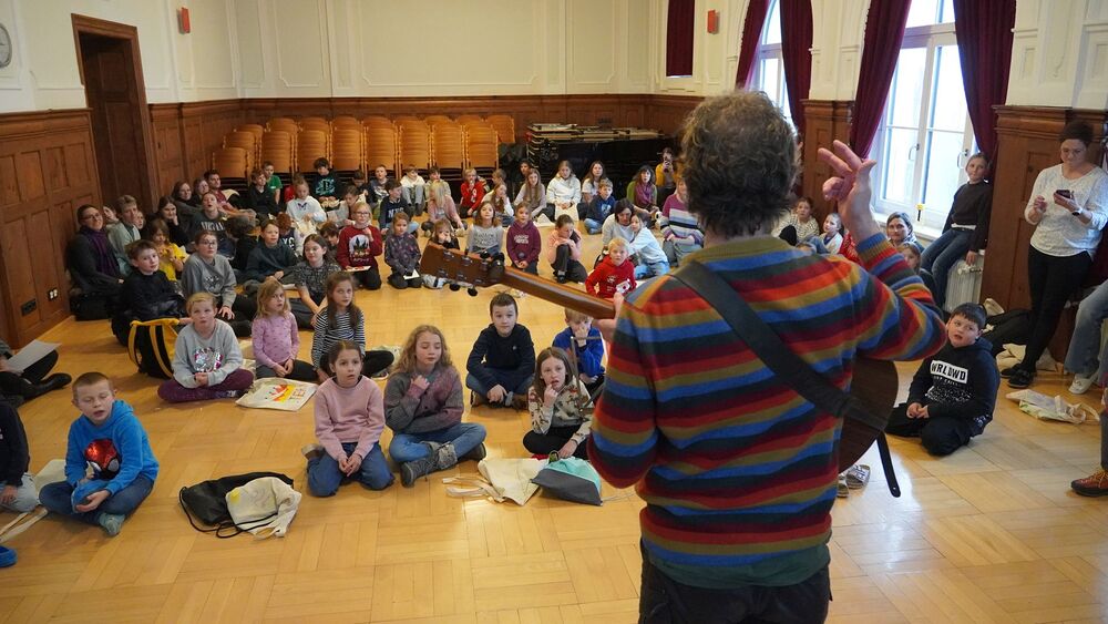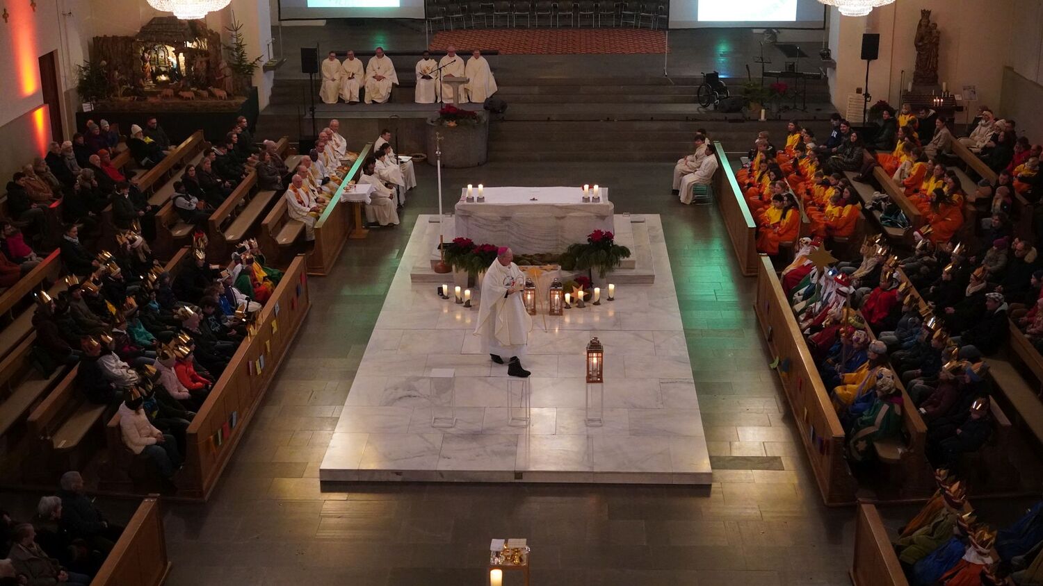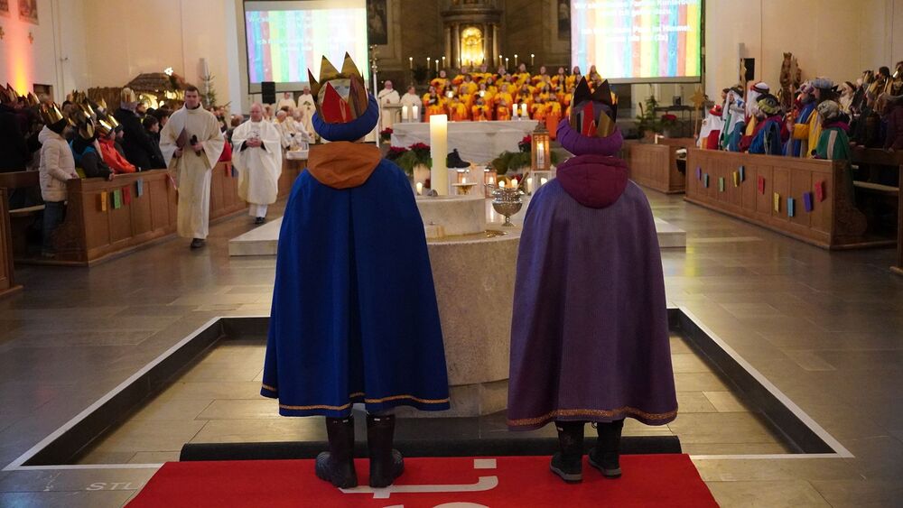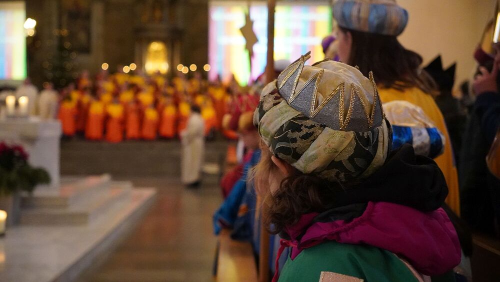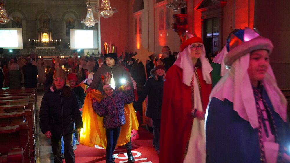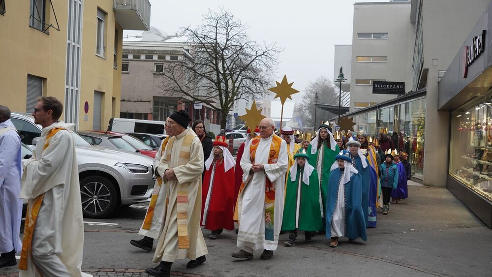 Nach den Workshops und einer kleinen Stärkung, probten die Kinder das neue Sternsingerlied gemeinsam mit dessen Komponisten Konrad Bönig. Danach begann die Vorbereitung auf die Prozession und den feierlichen Einzug zur Pfarrkirche St. Martin. Begleitet von Bischof Benno Elbs und anderen Zelebranten zogen die Kinder, gekleidet in ihren bunten Gewändern und mit strahlenden Kronen, durch die Innenstadt von Dornbirn.
