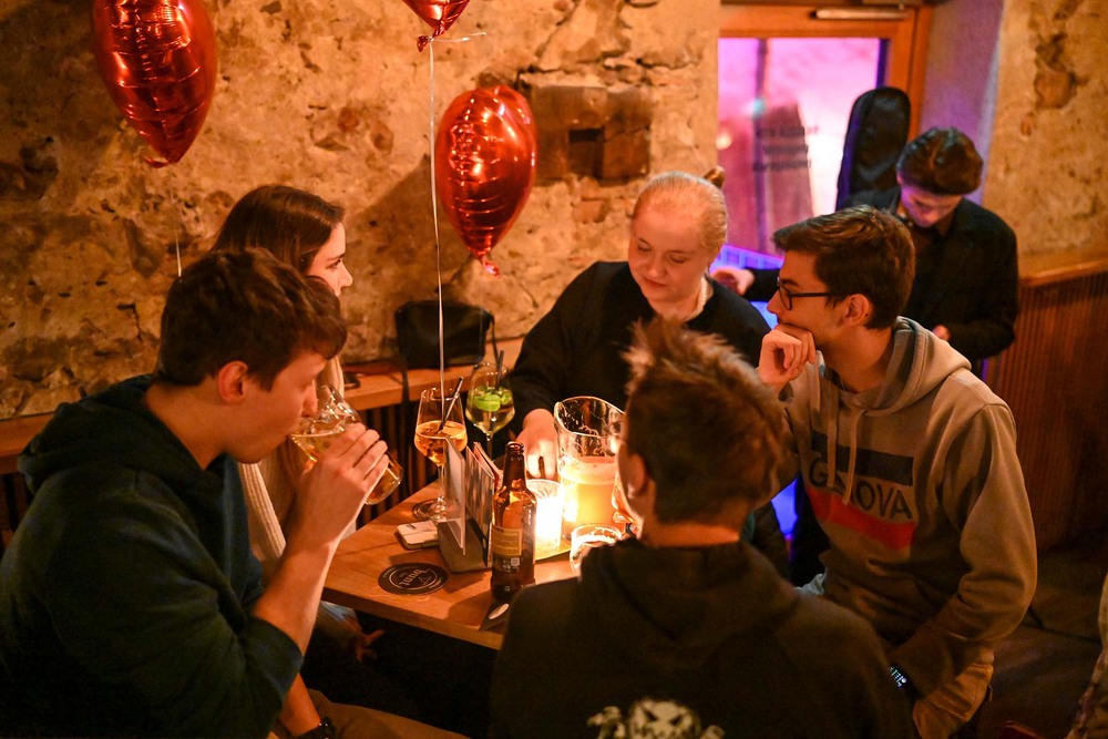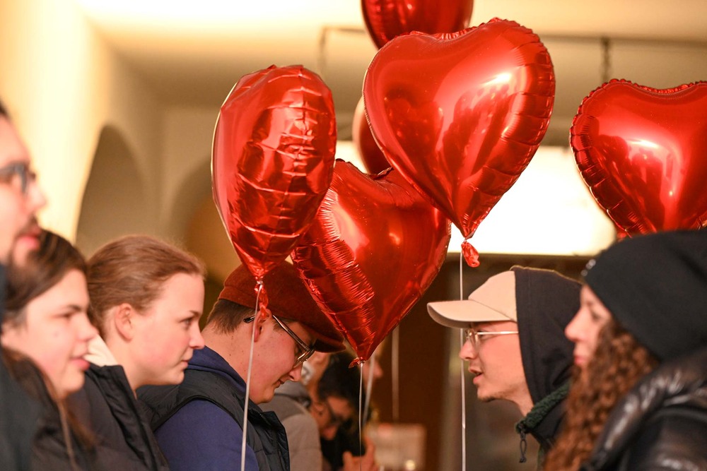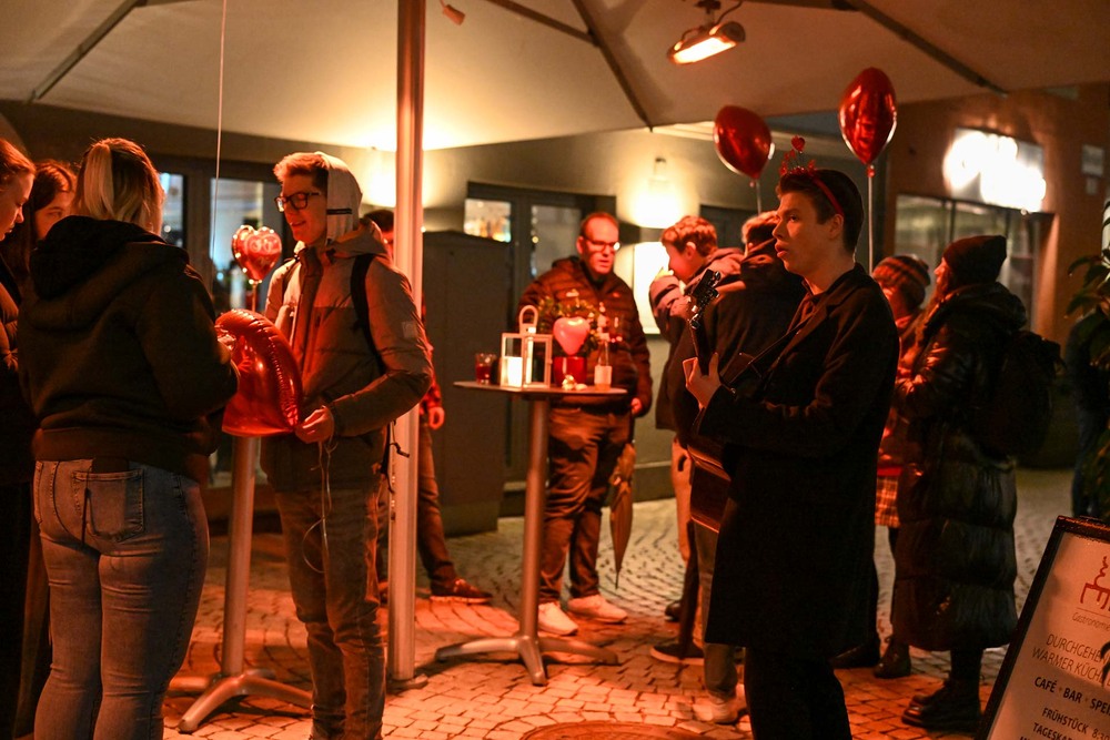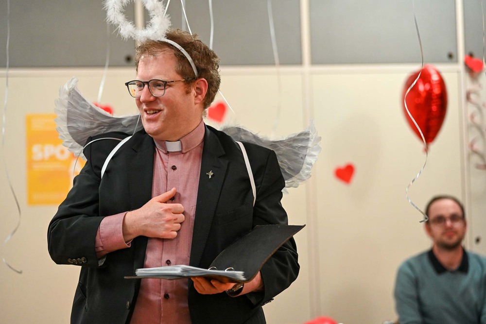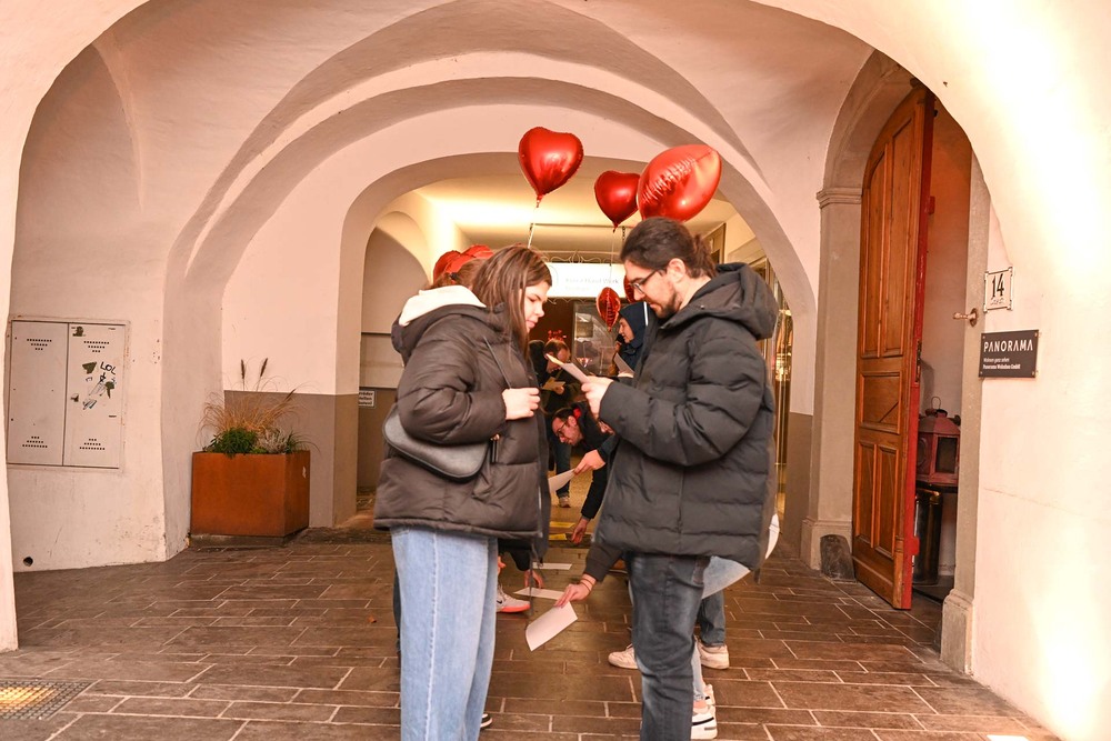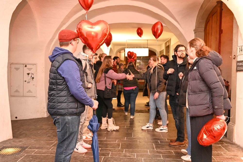 Mittendrin ist Amor und Jugendseelsorger Fabian Jochum – gut erkennbar an den Engelsflügeln und dem Herzchen Pfeil mit Bogen. Er richtet seine Worte an die Anwesenden und eröffnet die Veranstaltung mit einem Sneakpeak ins Programm. Nach seiner Ansprache, in der es um den Heiligen Valentin und die Bedeutung des eignen Namens geht, spazieren die 25 Singles los. Abgebogen ums erste Eck, startet Mission Kennenlernen. „Wem hast du zuletzt eine Freude gemacht?“, und „Gehört der Besteckgriff nach oben, oder nach unten im Geschirrspülkorb?“, sind Fragen, die auf den Gesprächskärtchen beim Speeddating-Spiel stehen. Spätestens jetzt ist das Eis gebrochen und auf dem Weg zur nächsten Station ist von der zurückhaltenden Stimmung keine Spur mehr. Beim Dogana sind alle auf einen „Liebestrunk“ (Punsch) eingeladen und man hat schon das Gefühl, dass da und dort die Funken fliegen. Gitarrist Elias trällert fürs Feeling ein paar romantische Songs und untermalt damit die tolle Deko vor dem Lokal aus Herzchen und Co.