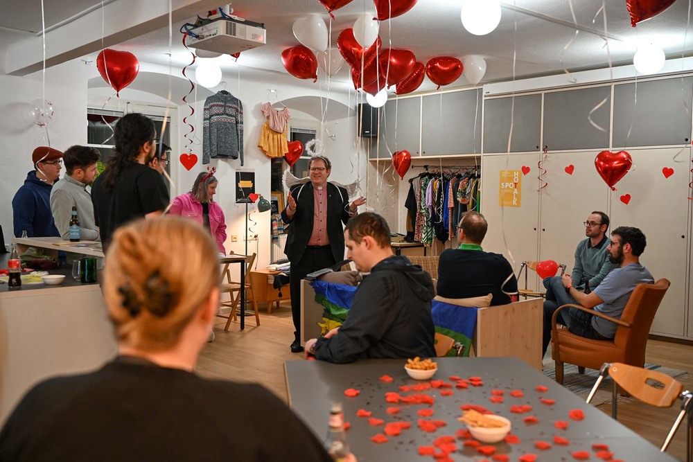 Neben dem Skater mit Cordjacke steht ein junger Mann im schwarzen Filzmantel. Eine Gruppe junger Frauen steht mittendrin, das Publikum ist also bunt gemischt. Einige halten eine Limo oder ein Bierchen in der Hand, andere haben es sich auf der Couch bei den Chips gemütlich gemacht. Im Hintergrund läuft schon mal eine romantische Playlist und über der Couch hängt eine Regenbogenflagge. Hier soll sich jede*r willkommen fühlen. Es herrscht noch eine etwas verhaltene, aber neugierige Stimmung. Doch das soll sich bald ändern. Die Junge Kirche Vorarlberg versucht nämlich bei ihrem „Singlegottesdienst“ die Bahnen zum Kennenlernen in gemütlicher Atmosphäre zu bereiten. Ob das gelingt?