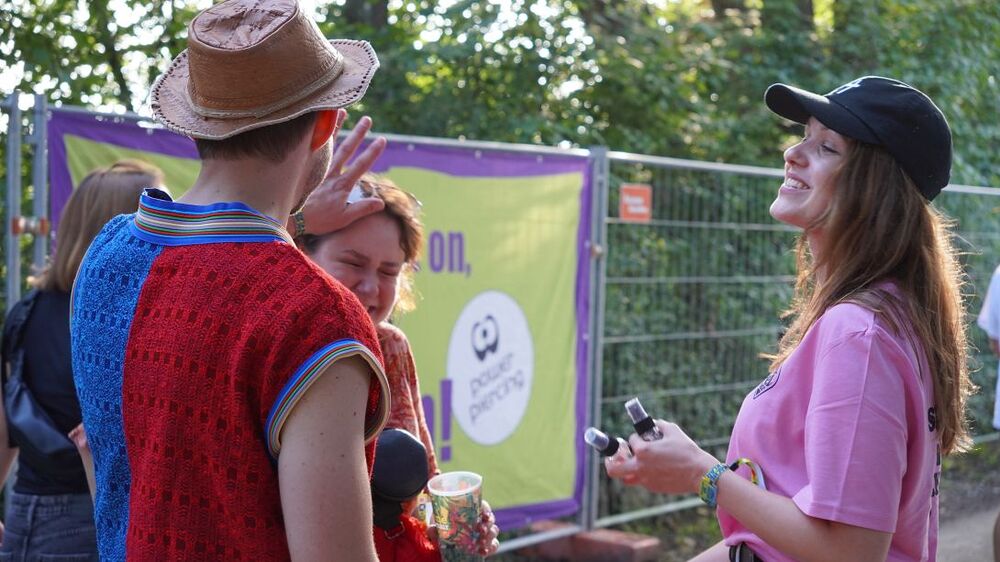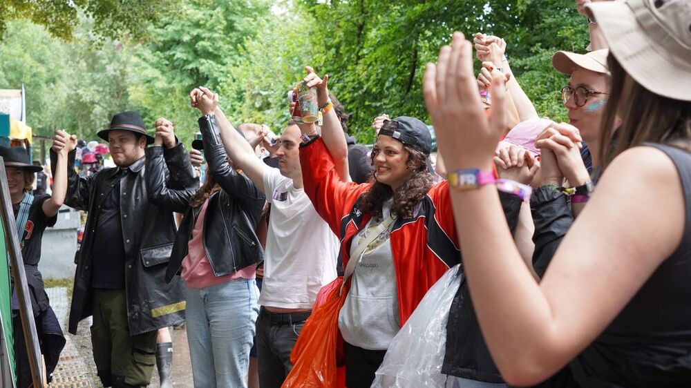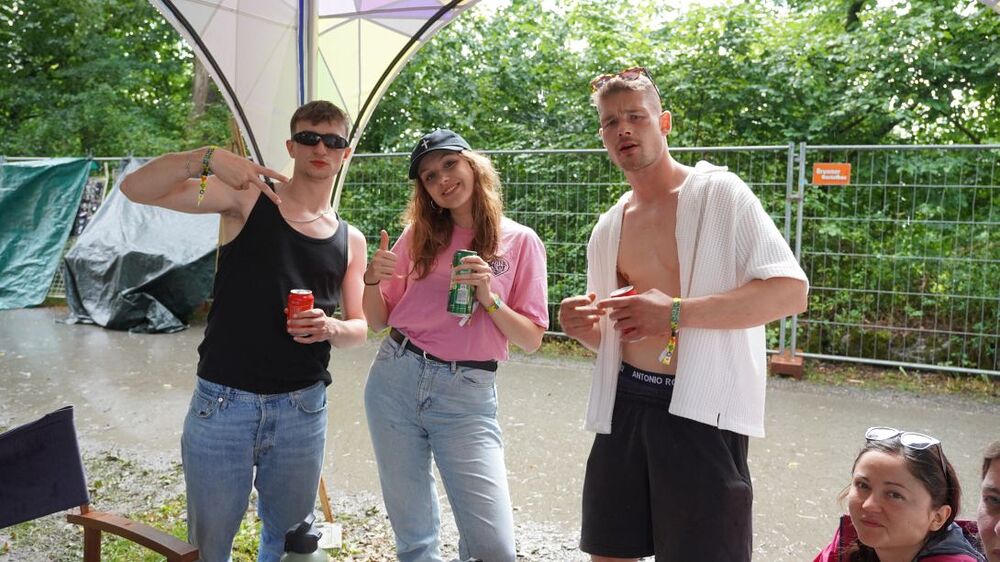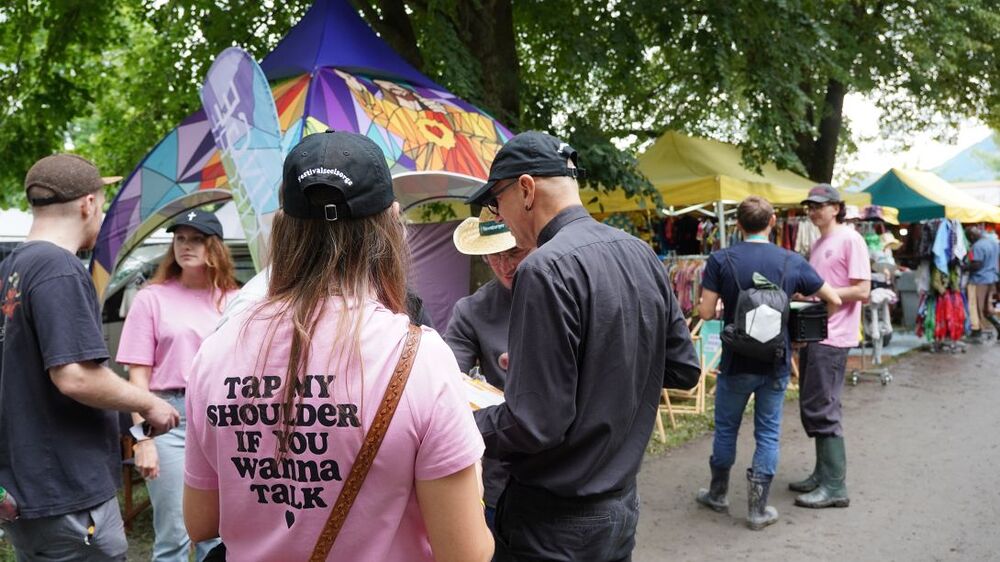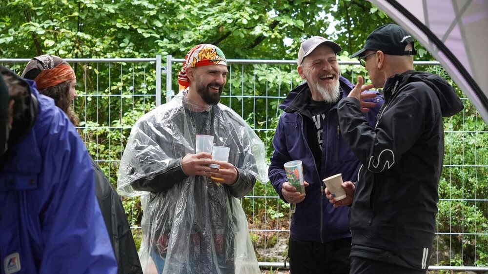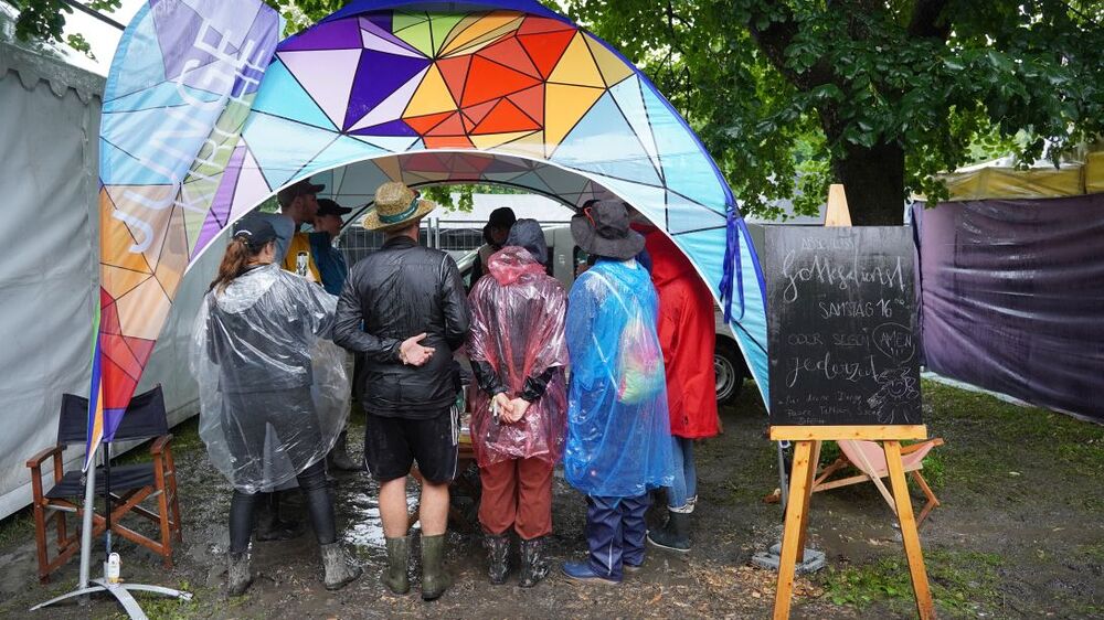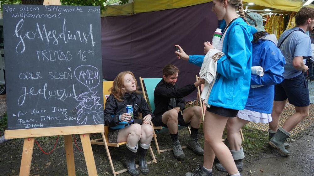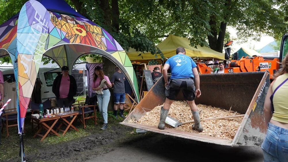 Als sich am Donnerstagmorgen um 10 Uhr die Pforten zum Festivalcamping öffneten, schüttete es wie aus Eimern. Da hilft alles nichts: Festivalbändchen holen und auf ins Abenteuerland. Nach einem kurzen Check-in mit Matthias, dem Koordinator der Sicherheitskräfte war unser 5-Köpfiges Festivalseelsorgeteam (erkennbar am Cap mit Kreuz und am rosafarbenen Tshirt) einsatzbereit. Auch die Hackschnitzel die die PopUpChurch der Jungen Kirche auf trockenen Boden betteten waren schnell organisiert und somit war das Projekt voll auf Kurs.