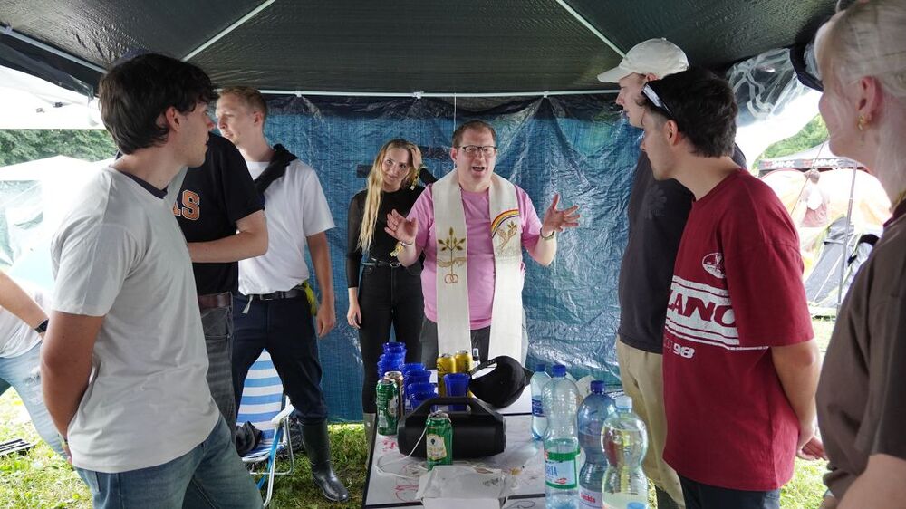Es dauerte nicht lange, und schon standen die ersten Jugendlichen unter dem Zelt. Man kennt sich ja mittlerweile, immerhin ist die Junge Kirche schon seit Jahren mit dabei und unterm Jahr passiert dann doch das eine oder andere, das man sich gern erzählen möchte. Es dauerte nicht lange, und unsere Kirche war voll, jeder Platz besetzt und es gab Lebens-, Liebes- und Jobupdates.