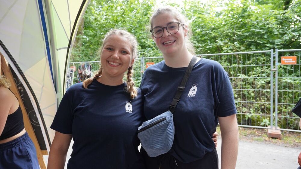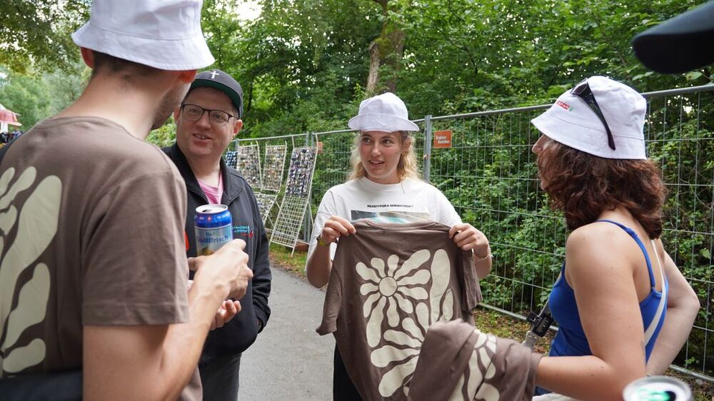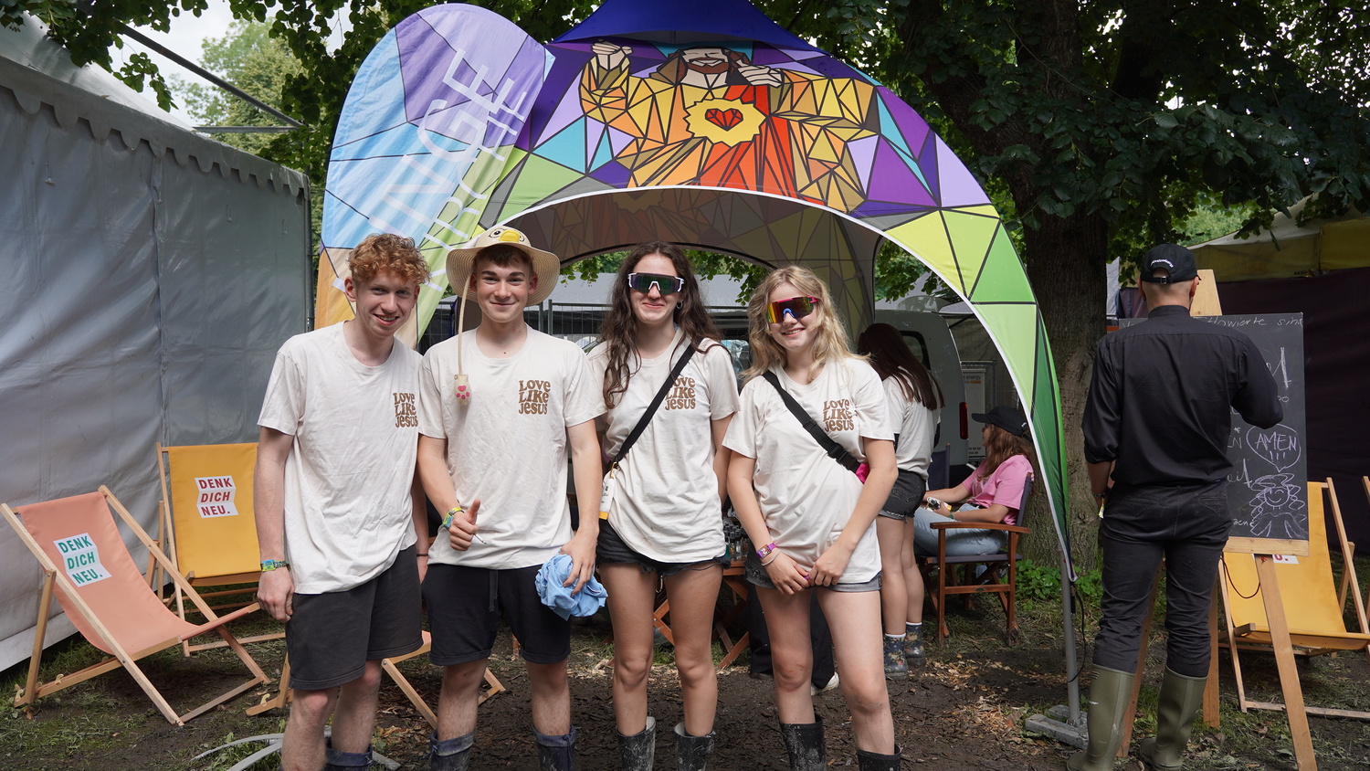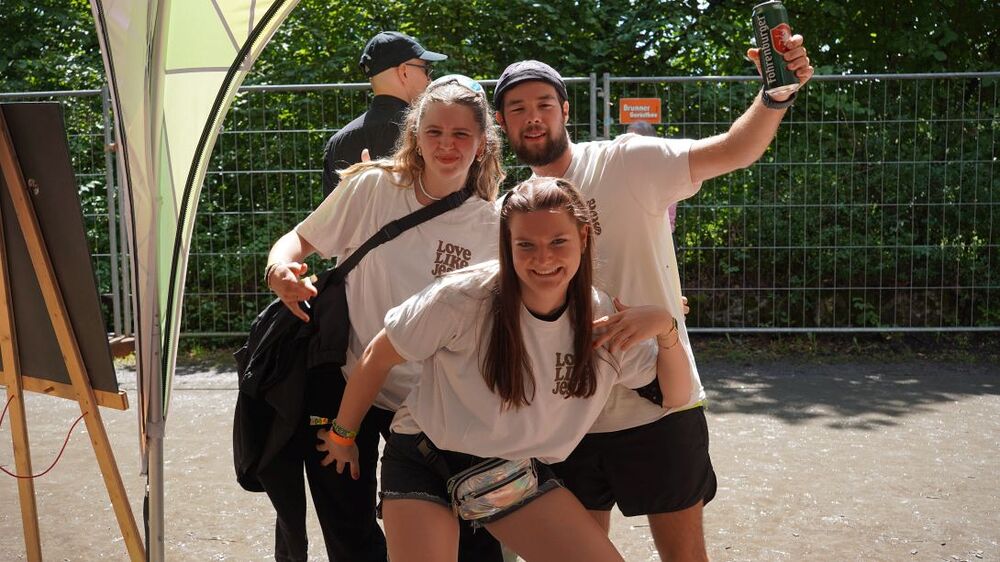 Unter den Anwesenden präsentierte eine Gruppe ihre passenden Outfits: die Festival-T-Shirts der Jungen Kirche von den letzten Jahren. Schwer fiel ihnen die Entscheidung zwischen den beiden Tshirts für 2025. „Love Like Jesus“ oder „Be the Light“ fiel nicht leicht, schlussendlich gewann dann doch die Liebe und es wurde „Love Like Jesus“ in Herzform. Die Tshirts entstanden wie immer mit Denk Dich Neu, einer Initiative der Katholischen Kirche Vorarlberg, die Start-ups unterstützt, um mit Jugendlichen im kirchlichen Kontext in Kontakt zu treten.