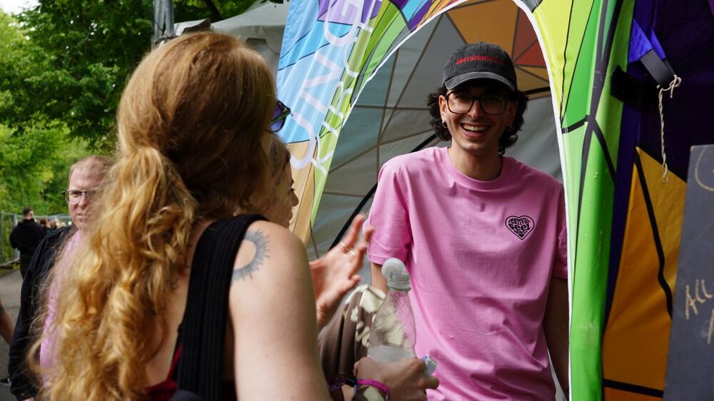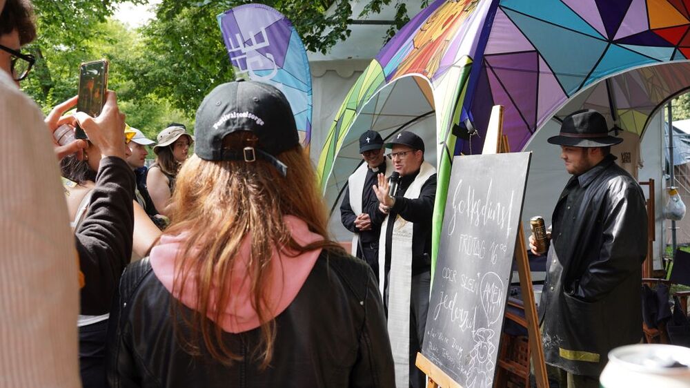 PopUpChurch? Das ist ein quietschbuntes Zelt mit Jesus-Print unter dem Liegestühle und Tische zum entspannen einladen.